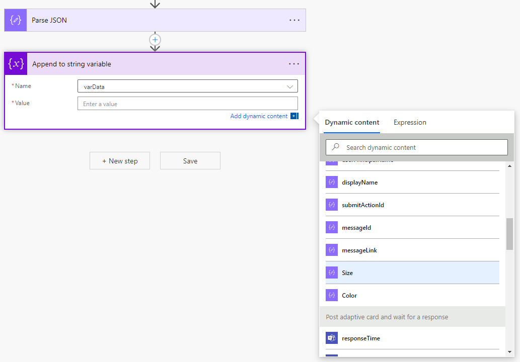 (Optional) I like to add a variable at the top level of my Power Automate Flow, something like VarColor so I can store the information from the output from the Parse JSON. You can of course just keep it as regular dynamic content. (If you’re using different nested steps a variable may be easier to work with)