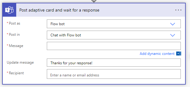 - Add a step, click on Teams, Post an adaptive card and wait for a response.