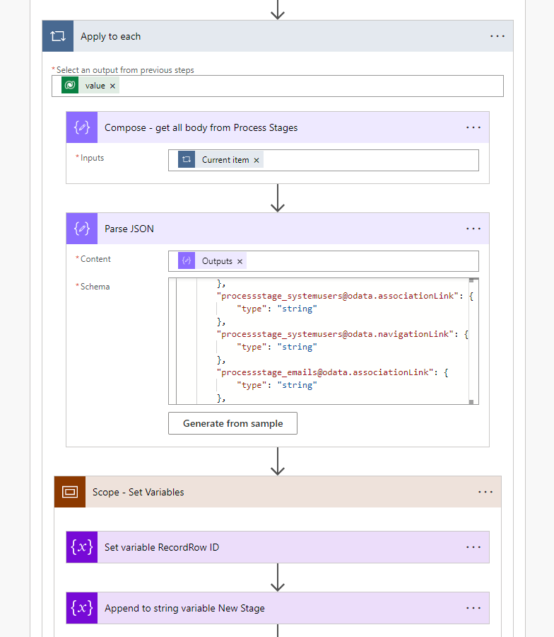 outputs('Compose_-_get_all_body_from_Process_Stages') - Schema: Click on Generate from Sample, and use the output body as grabbed in the earlier step