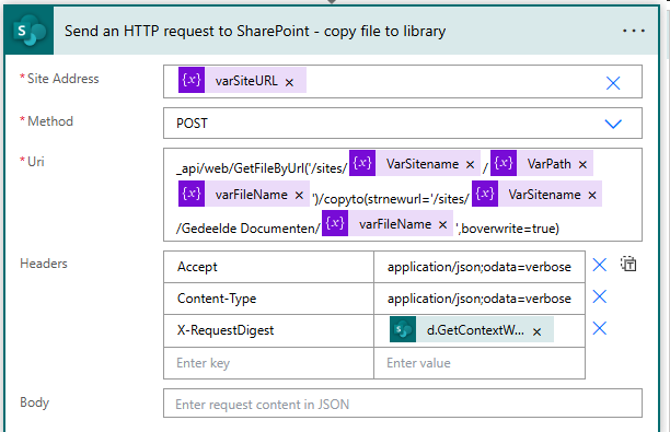 URI: _api/web/GetFileByServerRelativeUrl('<source-file-url>')/copyto(strnewurl='<destination-file-url>',boverwrite=true)